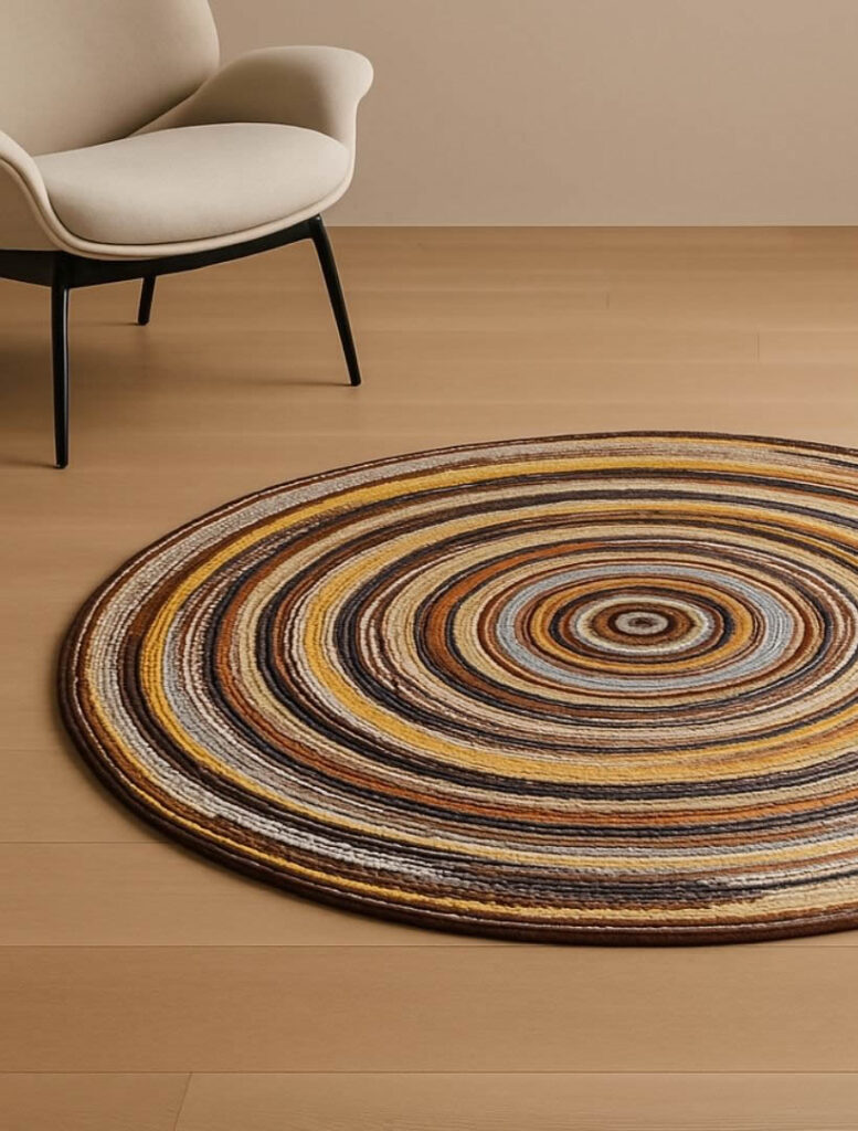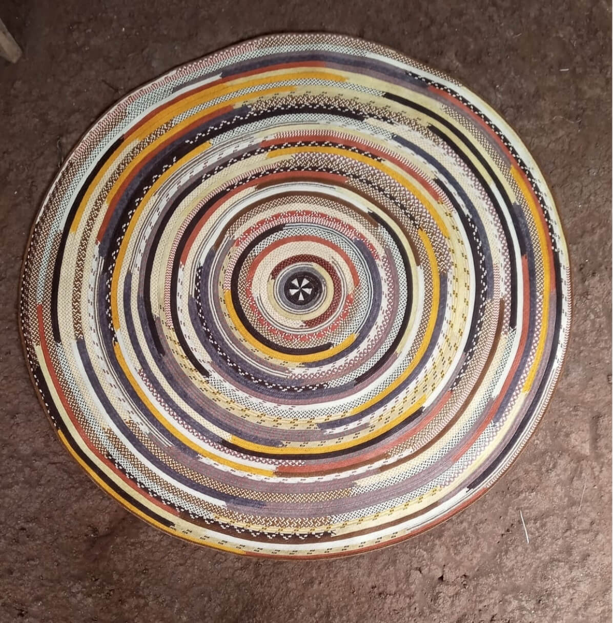 Dieser handgefertigte Teppich besticht durch sein geometrisches Spiraldesign und seine außergewöhnliche Verarbeitungsqualität. Jeder Arbeitsschritt – von der Auswahl der feinsten Palmfasern über das sorgfältige Aufspalten und Färben bis hin zum gleichmäßigen Flechten und linearen Vernähen – zeugt von handwerklicher Präzision und einem hohen ästhetischen Anspruch.